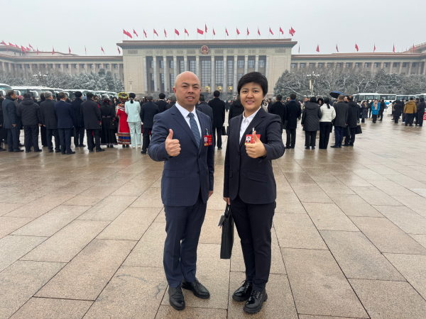 今年全国两会期间,陈雨佳和汪玉成在人民大会堂前合影留念(受访者供图)
