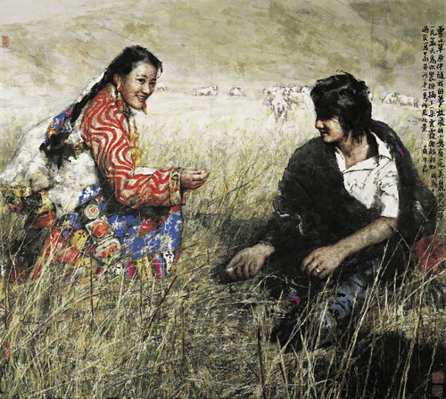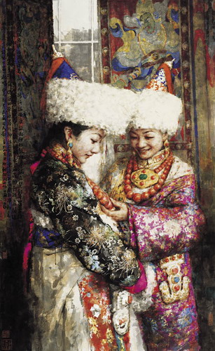 在对藏民的刻画中,南海岩说,每一年画中姑娘们的服饰都会有些变化,而他在整体的用色上也会有新的灵感,对美与时尚的追求总是一个共同的话题。南海岩说:“前不久,藏族姑娘阿桑告诉我,她正在准备代理一家藏族最时尚的品牌,等明年我再回去的时候就可以看到了。”