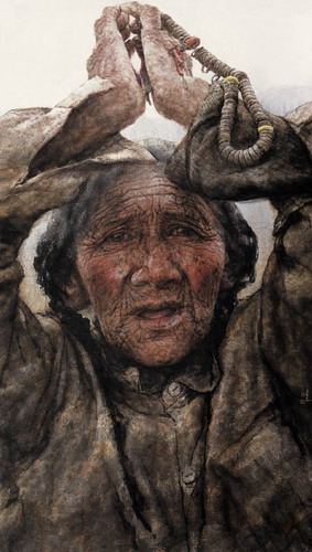 对比这些年来的创作,南海岩表示,早期的作品画面表现比较压抑,2000年后的作品则显现出一种积极向上的乐观面貌。“早期作品里藏民的形象,衣着朴素色彩凝重,人的肤色偏黑、粗糙,人物眼神里流露岁月沧桑给人的压抑,整个画面给人一种肃穆的感觉。”南海岩说。如作品《祈祷》中,他以细腻的笔触与厚重的色彩刻画了一个虔诚的老妇形象,手、脸、眼神,那纵横交错的皮肤纹理,饱经风霜的一筋一脉的刻画,浑浊的眸子里流露出难以言表的感情,有一种令人惊讶的震撼力。作品《守望》《吉祥的阳光》这两幅作品中的藏族少女,南海岩以平易自然的方式来捕捉人物的精神面貌。如今,藏民的生活富裕了,心中的快乐、喜悦、幸福感无以言表地被南海岩的画面体现出来。南海岩笑着说:“每年回到藏区,姑娘们的服饰都会发生变化,与时尚生活越来越近了,今年藏族女孩阿桑穿的蓝色丝绸藏袍上绣着白色的蝴蝶,格外的漂亮。”今年,南海岩打算以阿桑的形象创作几幅新作品。