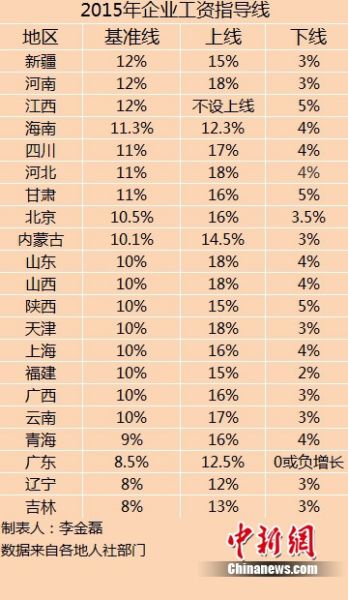 记者梳理发现,与2014年相比,上述21个省份今年的企业工资指导线多为持平或下调。