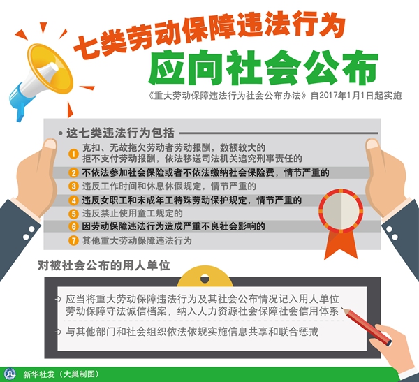 新华社北京9月12日电(记者徐博)《重大劳动保障违法行为社会公布办法》自2017年1月1日起实施。人力资源和社会保障部劳动监察局相关负责人12日说,七类重大劳动保障违法行为应当向社会公布。
