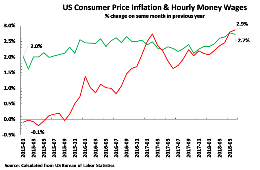 The fact tariffs cause price rises has a seriously harmful effect for the US population because inflation is already causing US real wages to fall. This is shown in Figure 1. Since the beginning of 2015 the rate of increase of US hourly money wages has risen from 2.0% to 2.7%. But in the same period the US consumer price index rose from -0.1% to 2.9%. As inflation is now higher than the increase in money wages US real wages are falling.