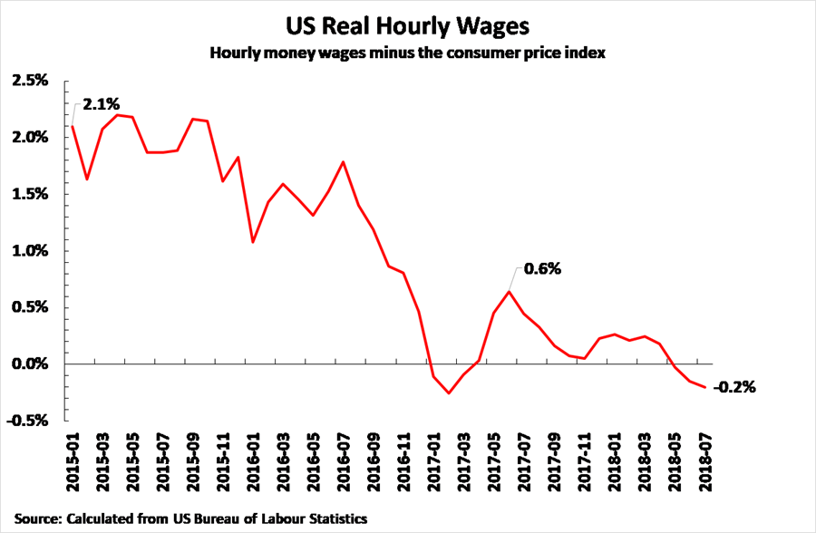 President Trump’s administration, by introducing tariffs against China, is directly acting to reduce the living standards of the US population. This will make worse a situation which is already quite serious – as US real wages, that is money wages adjusted for price rises, have been falling for the last three months due to rising inflation.