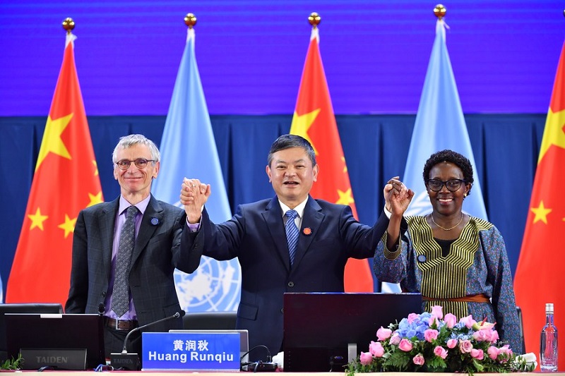 Chinese Minister of Ecology and Environment Huang Runqiu (C) poses for a group photo with Elizabeth Maruma Mrema (R), executive secretary of the Convention on Biological Diversity, and David Cooper, deputy executive secretary of the Convention on Biological Diversity, after the closing plenary of the High-Level Segment of the first part of the 15th meeting of the Conference of the Parties to the Convention on Biological Diversity (COP15) in Kunming, southwest China’s Yunnan Province, Oct. 13, 2021. (Photo/Xinhua)