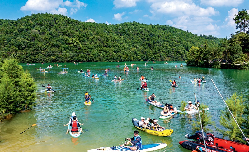 Visitors enjoy water sports such as paddleboarding and kayaking in Taohuajie Forest Park, in Changxing County of Huzhou City, Zhejiang Province, on August 3, 2025.