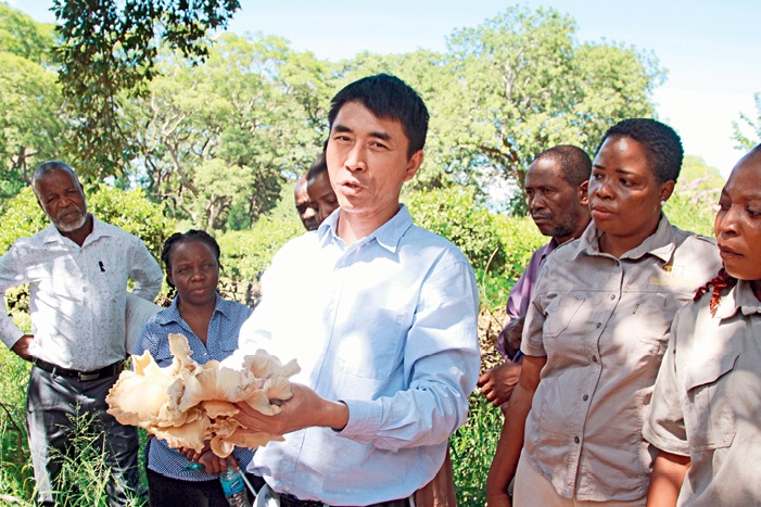 A Chinese expert instructs local trainees at a technical training course held by the China-aided juncao (grass to produce mushrooms) technology project team in Mashonaland West, Zimbabwe, on April 14, 2025.