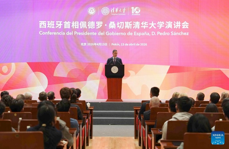 Spanish Prime Minister Pedro Sanchez delivers a speech at Tsinghua University in Beijing, capital of China, April 13, 2026. (Xinhua/Ma Xiaodong)