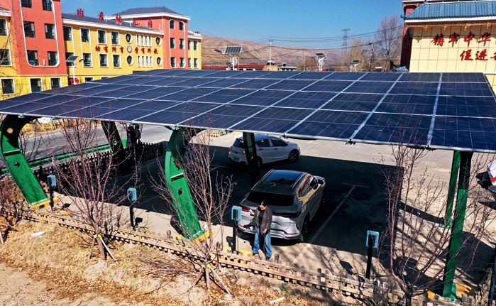 A villager is charging a new energy vehicle at a “Zero-Carbon Village” in Huzhu Tu Autonomous County, Haidong City, Qinghai Province on March 11, 2026.