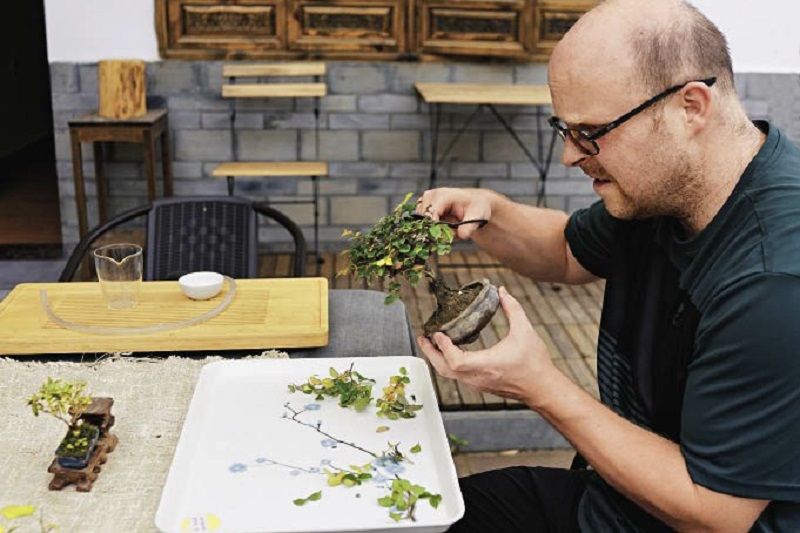 Inscribed on the National Intangible Cultural Heritage List, the Sichuan-style bonsai has attracted a particular enthusiast: Chad Sinclair from Canada. As a musician, teacher, and bonsai artist born in Vancouver, British Colombia, the 42-year-old has lived in China for 17 years. Recently, he moved his bonsai studio from downtown Chengdu, Sichuan Province, to Yanjiawanwan in Chongzhou, a county-level city under the jurisdiction of Chengdu. The move has helped him immerse himself more in the study of Sichuan-style bonsai. As he likes to be called Bai Xiong (polar bear), he calls his studio the “Baixiong Bonsai Garden.”