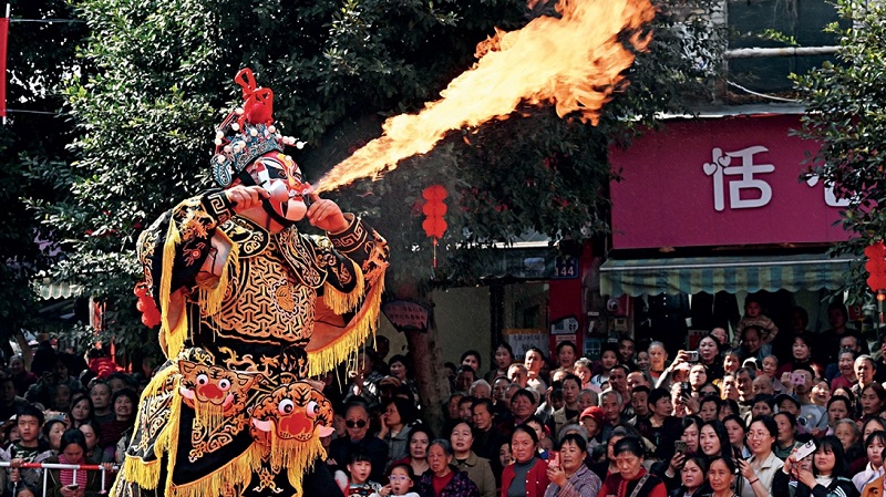 An artist showcases the Sichuan Opera stunt of fire-spitting in Neijiang City, Sichuan Province on February 25, 2026.