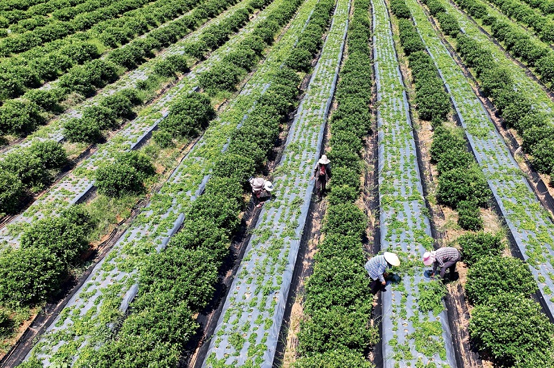 Farmers are tending to Ampelopsis japonica at a Chinese medicinal herb plantation in Ji’an, Jiangxi Province, on July 22, 2025. Green industries are helping local farmers increase their income and realize rural revitalization.