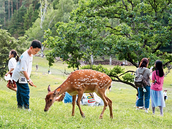 Visitors to the Jinshan Deer Park in Yichun City, Heilongjiang Province are enjoying close contact with local deer on scenic forested lawns during the peak summer travel season on August 5, 2025.