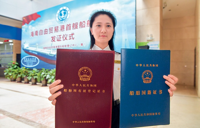 A staff member shows the first Certificate of Vessel’s Nationality issued by the Hainan Maritime Safety Administration and Yangpu Economic Development Zone. It is conferred on the vessel “COSCO Shipping Xing Wang,” making it the first ship registered under “Yangpu China” as its port of registry.