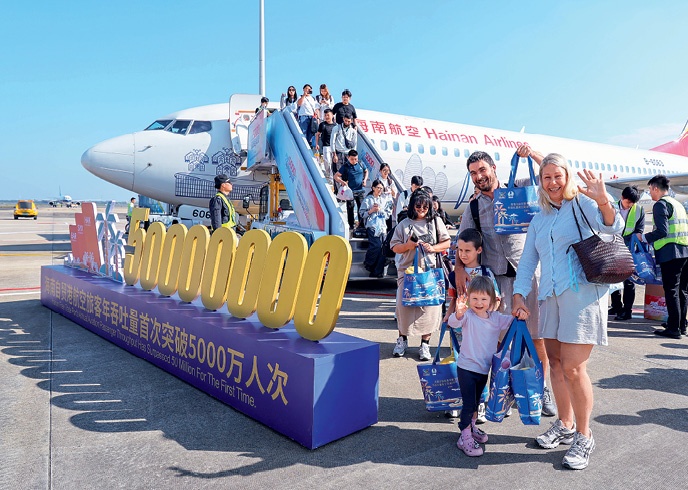 As Hainan Airlines’ Bangkok–Haikou flight and China Southern Airlines’ Chengdu–Haikou flight land in succession on December 30, 2025, the Hainan Free Trade Port’s passenger throughput in 2025 set a new annual record by surpassing the 50-million mark for the first time. The photo shows foreign passengers arriving at Haikou Meilan International Airport on a Hainan Airlines flight from Bangkok.