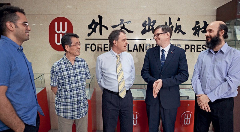 The five foreign experts with the Foreign Languages Press who recently wrote to President Xi Jinping: Aly Thabet Aly Mohamed Farag from Egypt, Kikuchi Shuji from Japan, David William Ferguson from the U.K., Timofey Bakhvalov from Russia and Burkhard Risse from Germany (left to right). Photo courtesy of China Pictorial