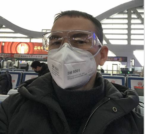The author is waiting at the Ningbo East Railway Station to return to Beijing on February 4 all dressed up with protective gear against the coronavirus.