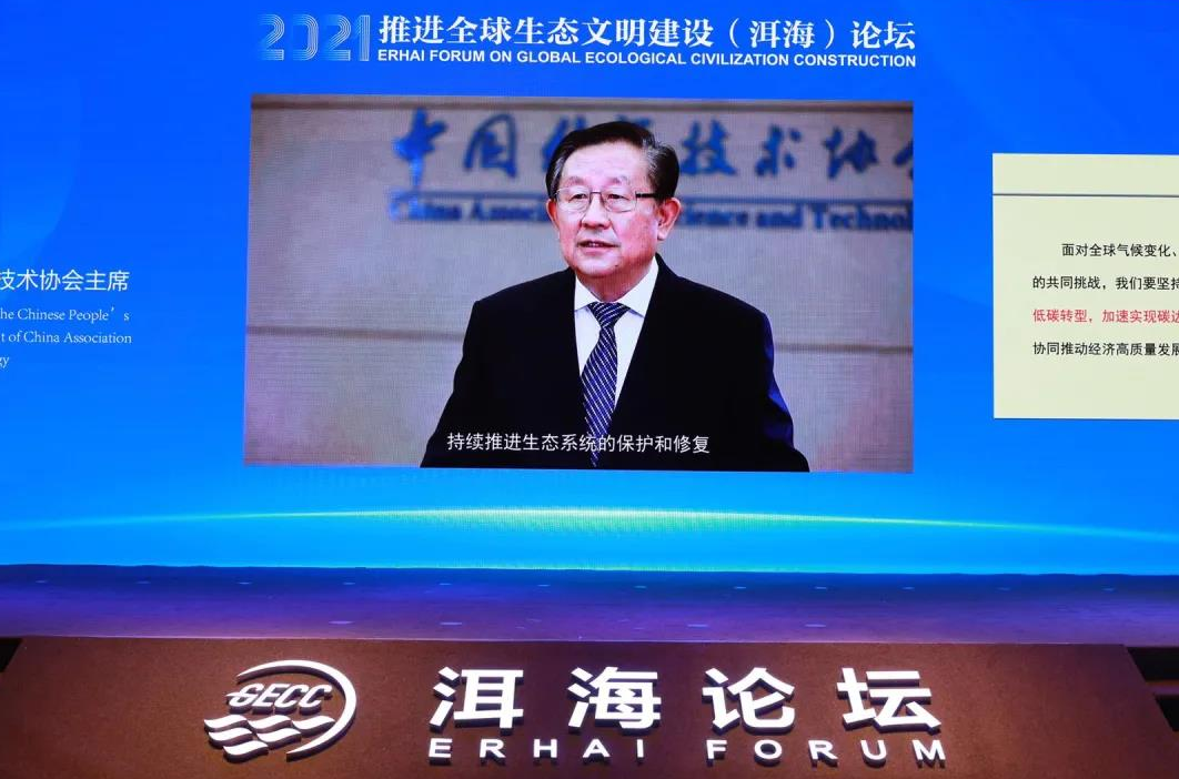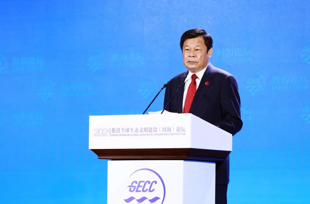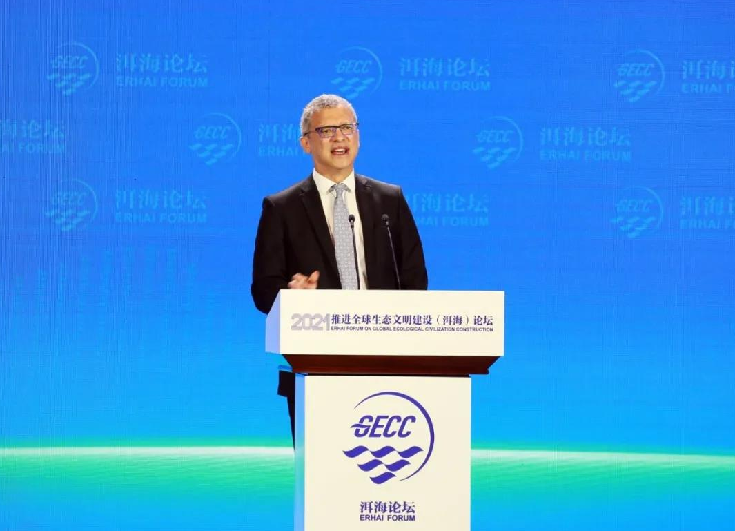 Du Zhanyuan, president of the CIPG, delivers a speech at the Erhai Forum on Global Ecological Civilization Construction held in Dali, Yunnan Province, on October 9, 2021.