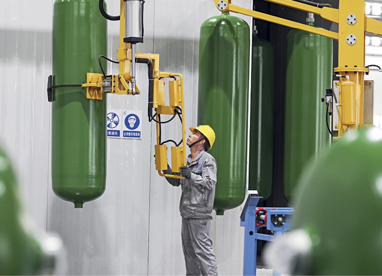 Un technicien travaille dans l’atelier de production de réservoirs d’hydrogène de l’entreprise GUOFUHEE, à Suzhou (Jiangsu), le 31 mai 2024.