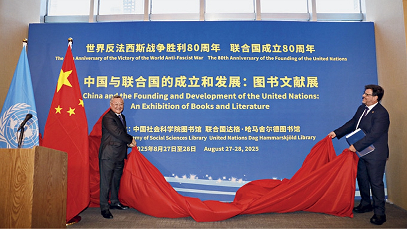 Inauguration d’une exposition pour le 80e anniversaire de la victoire de la Guerre mondiale antifasciste et de la fondation des Nations unies, à la bibliothèque Dag Hammarskjöld au siège à New York, le 27 août 2025