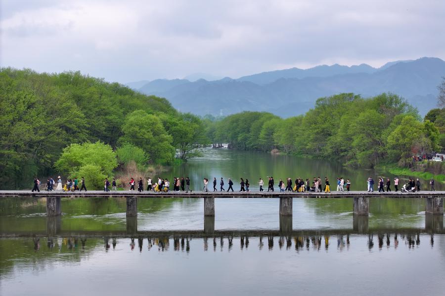 Des touristes se promènent dans une zone de terre humide pendant les congés de la fête de Qingming à Huangshan, dans la province chinoise de l'Anhui (est), le 4 avril 2026. (Photo : Fan Chengzhu)