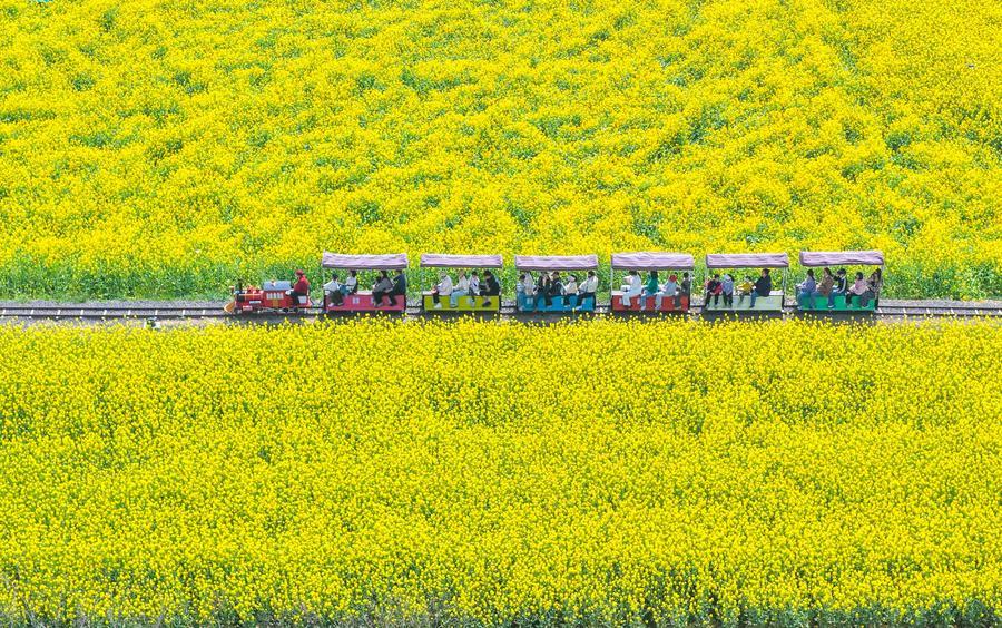 es touristes prennent le train pour une excursion dans un champ de fleurs pendant les congés de la fête de Qingming dans le district de Xuyi, dans la province chinoise du Jiangsu (est), le 4 avril 2026. (Photo : Xu Changyin)