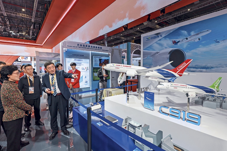 Des visiteurs admirent les maquettes des C919 et C929 à Shanghai, le 5 novembre 2024.