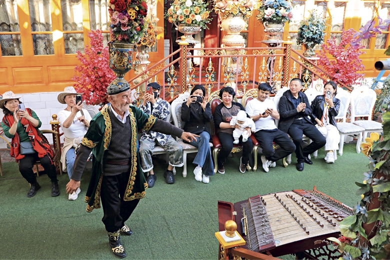Des touristes découvrent les coutumes ouïgoures dans la préfecture autonome kazakhe d’Ili de la région autonome ouïgoure du Xinjiang, le 8 avril 2025.