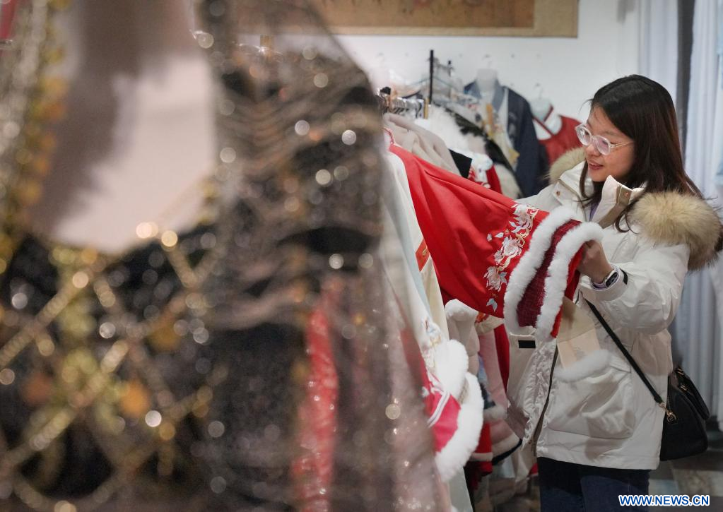 Une touriste choisit des habits traditionnels dans un magasin de l'ancienne ville de Luoyi, à Luoyang, dans la province chinoise du Henan (centre), le 22 février 2023. Selon les données officielles, Luoyang a rapporté 10,31 millions de visites en janvier, pour des revenus de 6,28 milliards de yuans (environ 902,44 millions de dollars), en hausse de 746,63% et 690,06% sur un an respectivement. (Photo : Li An)