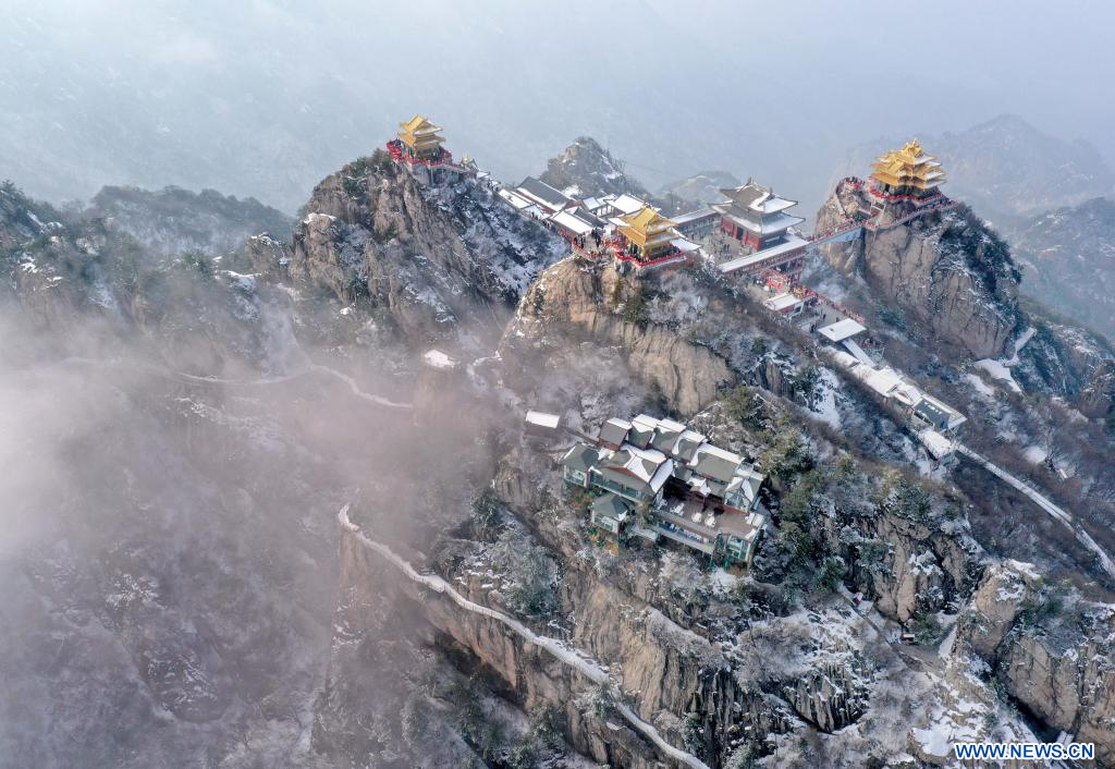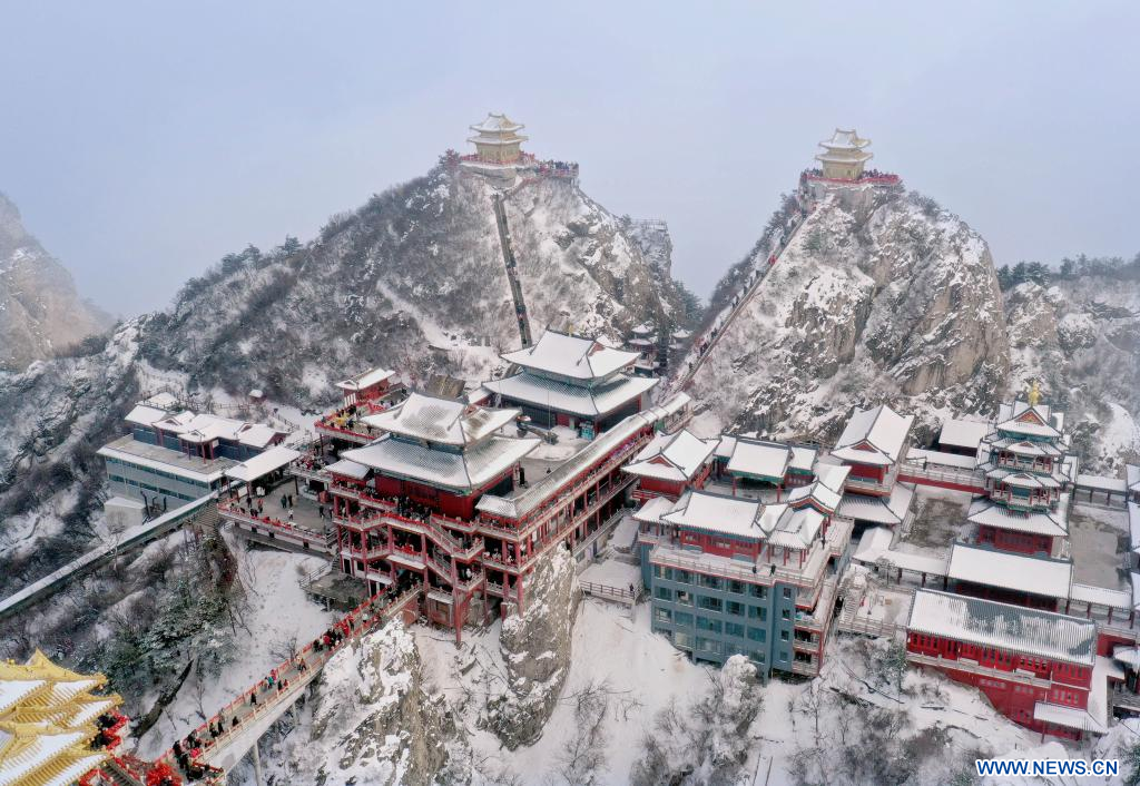Photo aérienne prise le 23 février 2023 du mont Laojun, à Luanchuan, district de la ville de Luoyang, dans la province chinoise du Henan (centre). Selon les données officielles, Luoyang a rapporté 10,31 millions de visites en janvier, pour des revenus de 6,28 milliards de yuans (environ 902,44 millions de dollars), en hausse de 746,63% et 690,06% sur un an respectivement. (Photo : Li An)