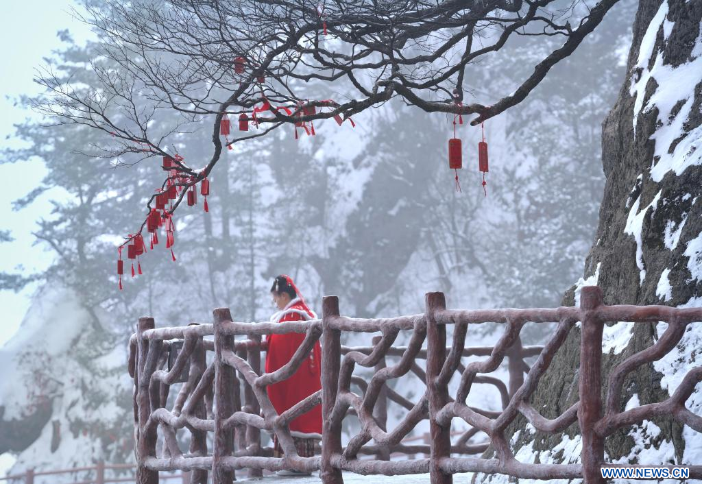 Une touriste visite le mont Laojun, à Luanchuan, district de la ville de Luoyang, dans la province chinoise du Henan (centre), le 23 février 2023. Selon les données officielles, Luoyang a rapporté 10,31 millions de visites en janvier, pour des revenus de 6,28 milliards de yuans (environ 902,44 millions de dollars), en hausse de 746,63% et 690,06% sur un an respectivement. (Photo : Li An)