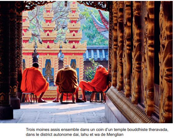 Les temples bouddhistes theravadas font également partie du quotidien des villages dai. Le temple du village de Mengsuo, dans le district autonome wa de Ximeng, est une vitrine des caractéristiques culturelles dai. Décoré dans des tons vifs, ce temple abrite une statue dorée de Bouddha debout, adossé contre un mur rouge, ainsi que des marches, des piliers, un mur d’enceinte et des décorations tout aussi dorés, sous un toit en tuiles rouges bordées de vert. Deux statues d’animaux de bon augure de teintes or et bleu gardent l’entrée.