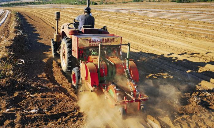 Habitant du village de Huangzhangzi à Chifeng (Mongolie intérieure), Lin Shufa cultive du millet en recourant à une machine agricole moderne, le 17 mai 2021.
