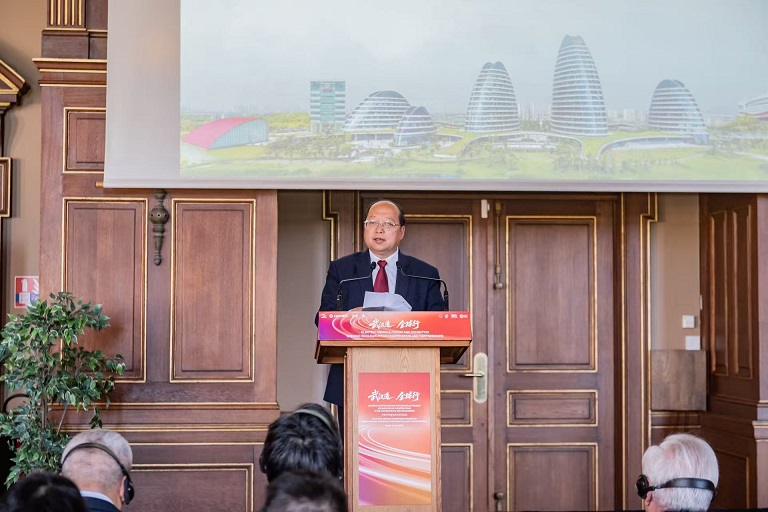 Liu Ziqing, membre du Comité permanent du Comité municipal de Wuhan du Parti communiste chinois et secrétaire du Comité de travail de la Zone de développement économique et technologique de Wuhan, prononce un discours.