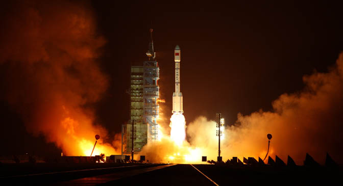 | The Long March 2F-T1 rocket sends the Tiangong 1 space laboratory into outer space on September 29, 2011. |