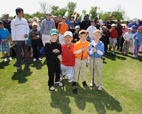 Guan Tianlang (second left) with junior golfers Stephen Faucheaux, Hunter McDermott and Bubby Demers at Lakewood Golf Club on April 20, 2013 in New Orleans, Louisiana. |