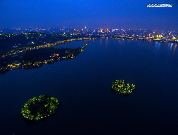 Photo aérienne prise le 24 mai 2016, montrant une vue de nuit du Lac de l'Ouest à Hangzhou, capitale de la province du Zhejiang (Est de la Chine). La Chine accueillera la réunion du Groupe des Vingt (G20) 2016 à Hangzhou, une ville touristique connue pour son site pittoresque du Lac de l'Ouest, les 4 et 5 septembre.