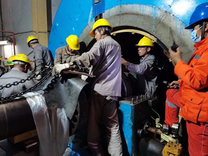 Sonderschicht: Während der Frühlingsfestferien 2023 bauen Arbeiter des Yangpu-Kraftwerks nach erfolgreicher Behebung eines Massefehlers den Rotor der Siemens-Gasturbine wieder ein. (Foto: Hu Cheng)