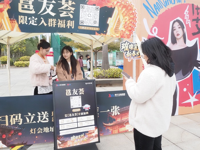 Überraschung für die Fans: Eine Zuschauerin scannt einen QR-Code, um sich ein kostenloses Ticket für die Laternenausstellung zu sichern. (Foto: Wang Ruying)
