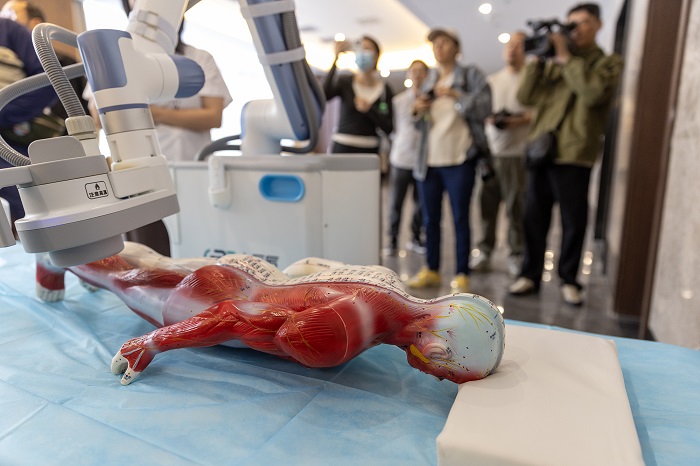 Üben am Model: Ein Moxibustion-Roboter zeigt, wie er Behandlungsbereiche identi ziert und die Wärme reguliert. (Foto: Duan Wei)
