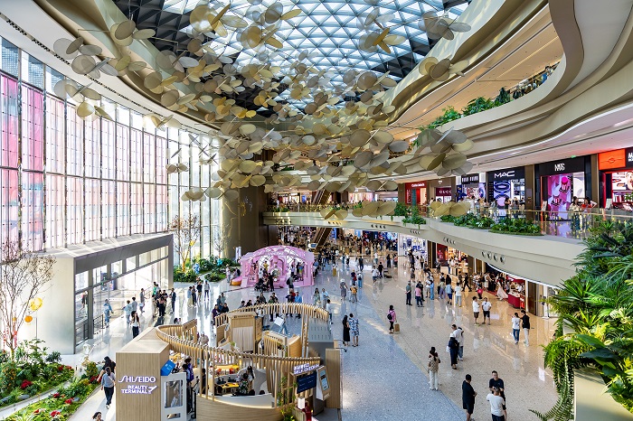 Shopping vor lichtdurchuteter Kulisse: Besucher aus a ler Welt decken sich im Duty Free-Shop der CDF Group in Sanya mit zo lfreien Waren ein. (Foto: Duan Wei)