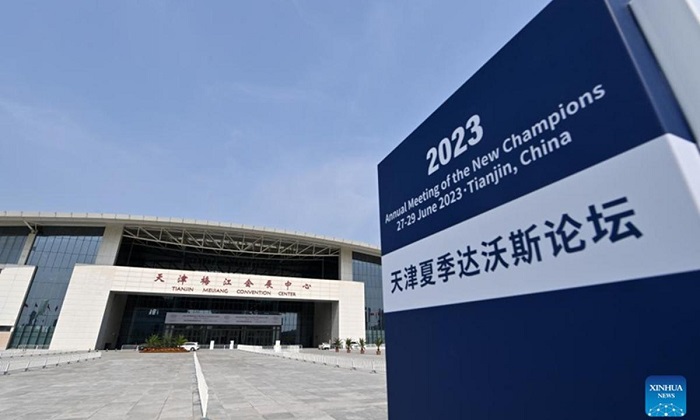 Dieses am 25. Juni 2023 aufgenommene Foto zeigt einen Blick auf das Tianjin Meijiang Convention Center, den Veranstaltungsort des 14. Jahrestreffens der New Champions, auch bekannt als Sommer-Davos-Forum, in der nordchinesischen Stadt Tianjin. Foto: Xinhua