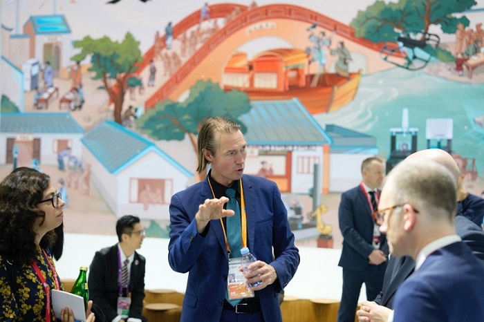 Emanuel Viklund, Executive Vice President für globales Marketing und internationalen Vertrieb von Hexagon, stellt am 5. November die Produkte seines Unternehmens auf der 8. CIIE vor.