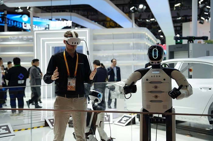 Gestatten, AEON! Ein Hexagon-Mitarbeiter demonstriert auf der 8. CIIE den humanoiden Roboter AEON.