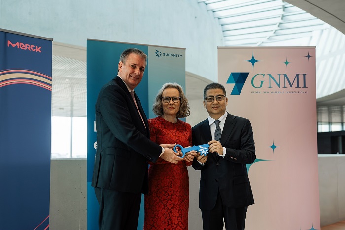 Schlüsselprojekt: GNMI-Vorstandsvorsitzender und -Geschäftsführer Su Ertian (rechts), empfängt den symbolischen Schlüssel für Susonity von Belén Garijo, Vorsitzende und CEO der Merck-Geschäftsleitung (Mitte), und Kai Beckmann, Merck-Vorstandsmitglied sowie CEO des Elektronikgeschäfts (links).