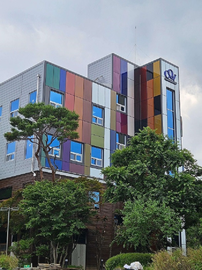 Farbige BIPV-Solarpanels am neuen Gebäude der CQV GmbH, eines Unternehmens von GNMI