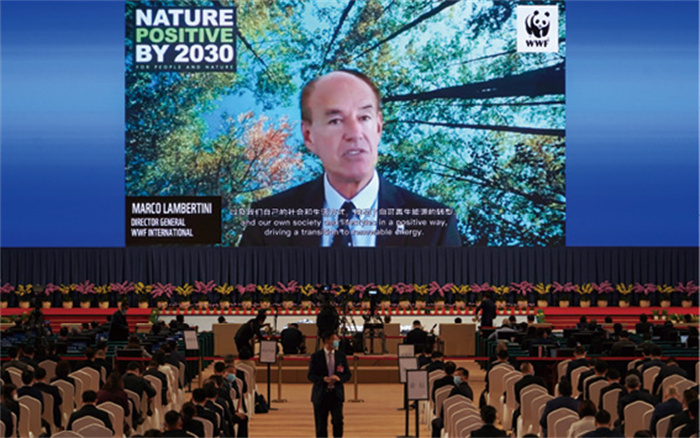 2021年10月14日,云南昆明,在《生物多样性公约》第十五次缔约方大会(COP15)期间召开的生态文明论坛上,世界自然基金会全球总干事马尔科·兰贝蒂尼通过视频表示,人类有必要制定一个关于自然的全球目标