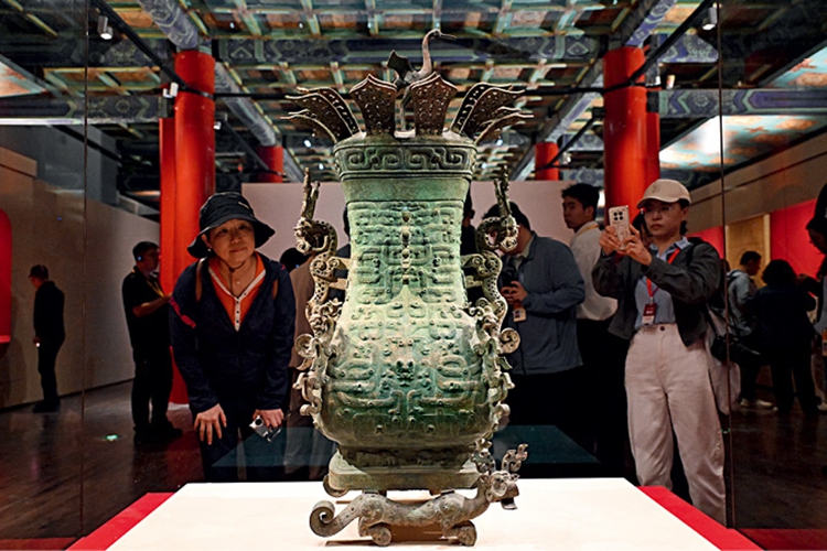 在“百年守护—从紫禁城到故宫博物院”展览上展出的青铜莲鹤方壶