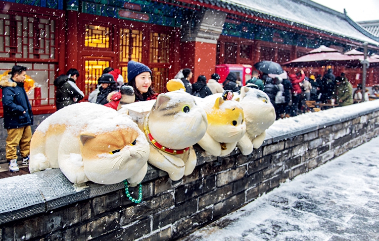 在故宫神武门西围房,雪中的文创故宫猫吸引游客驻足拍照