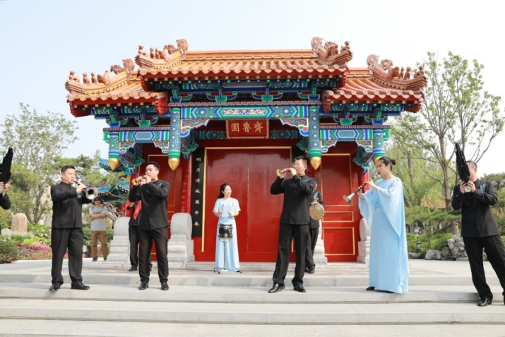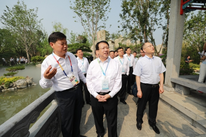 龚正(左二)参观北京世园会山东馆“齐鲁园”。(赵溪 摄)