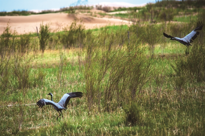 如今的库布其水肥草美,吸引仙鹤翩翩而降(亿利资源集团提供)